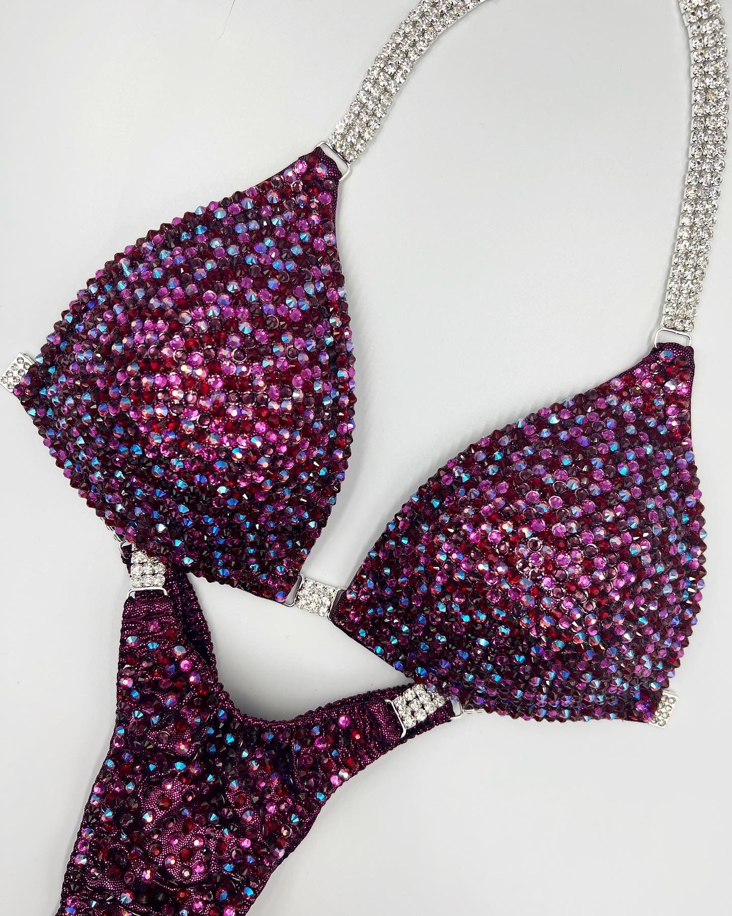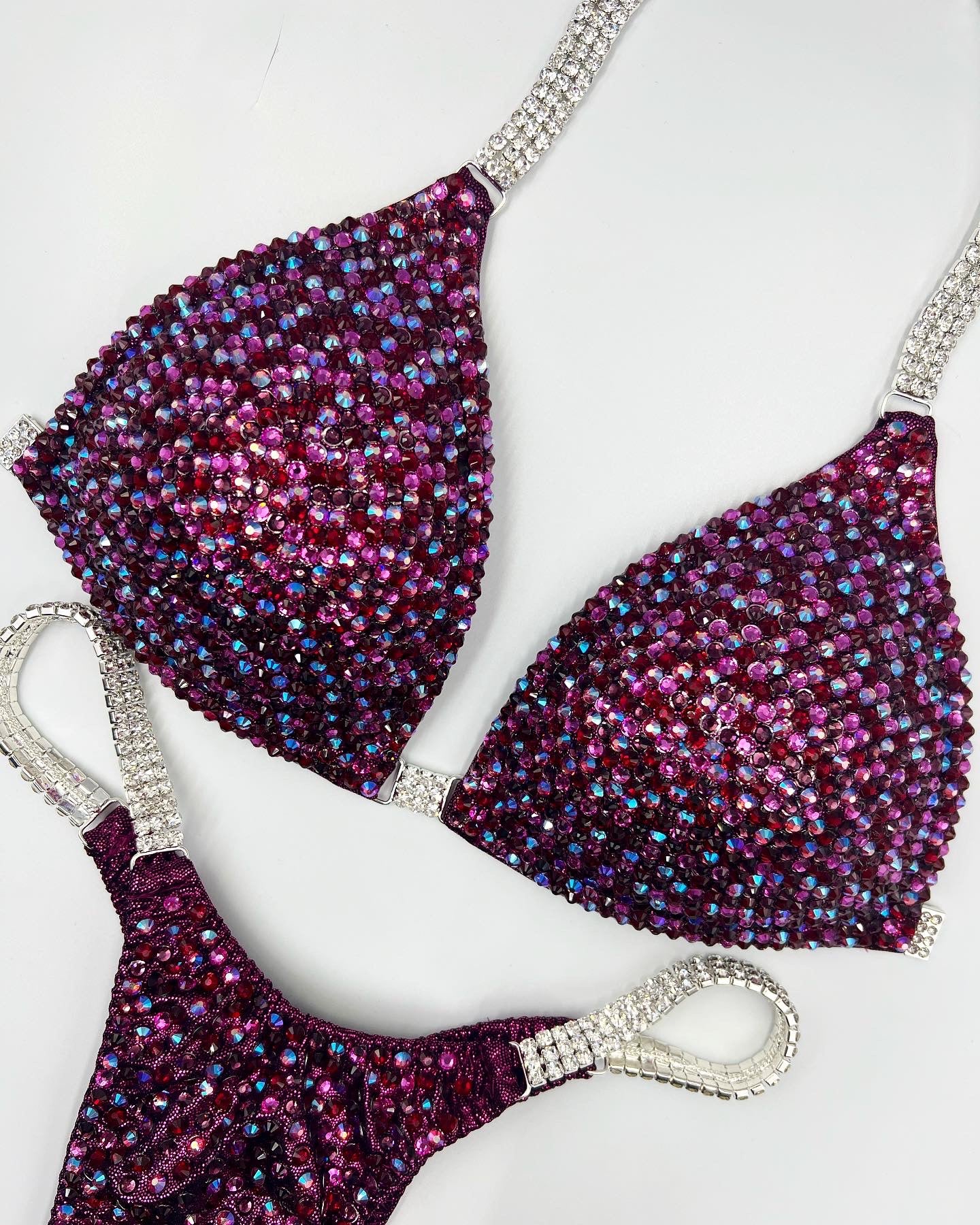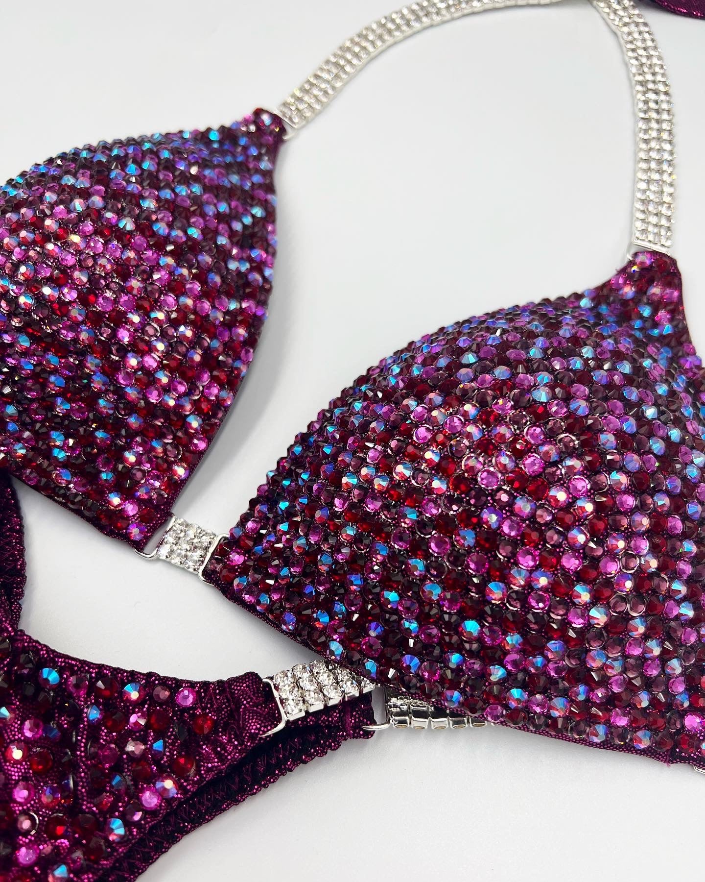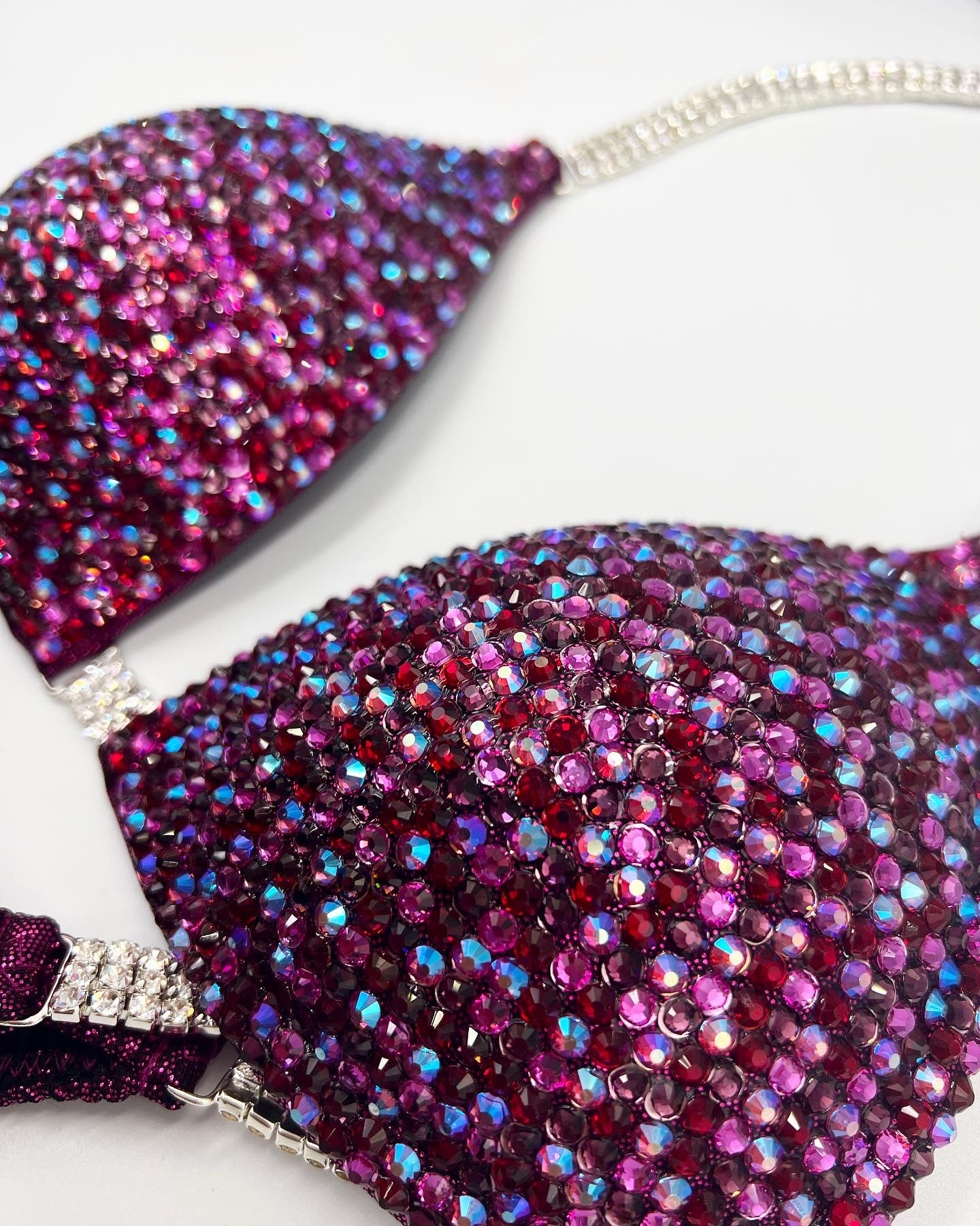 A very berry combo with this stunning mix! Blackcurrant shine base fabric with crystal colours siam, amethyst, fuchsia & fuchsia AB. This one pictured is a mix of both Preciosa and Czech glass for that best of both on sparkle and cost but is available as other crystal type options depending on your budget.