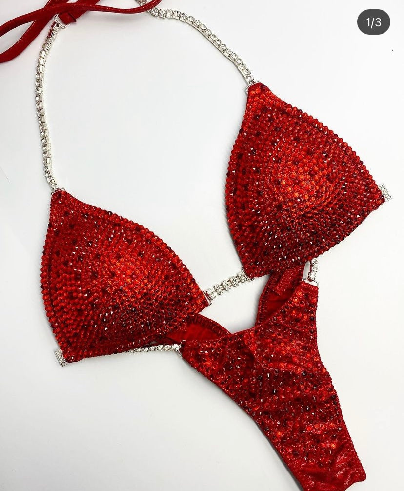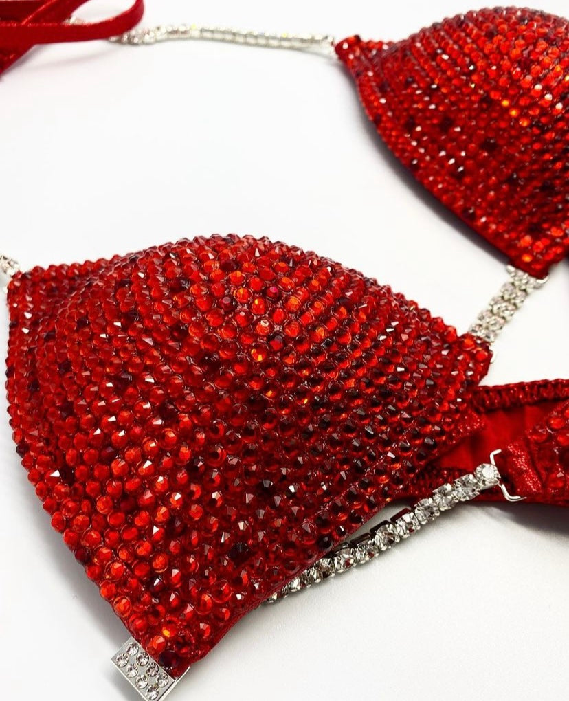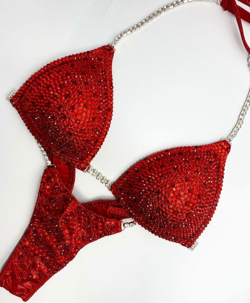 Who doesn’t love a classic red and with this having a deep red scatter throughout makes it oh so beautiful. Paired with single row strap connectors and long 2 row middle connector really finishes off the bikini perfectly.