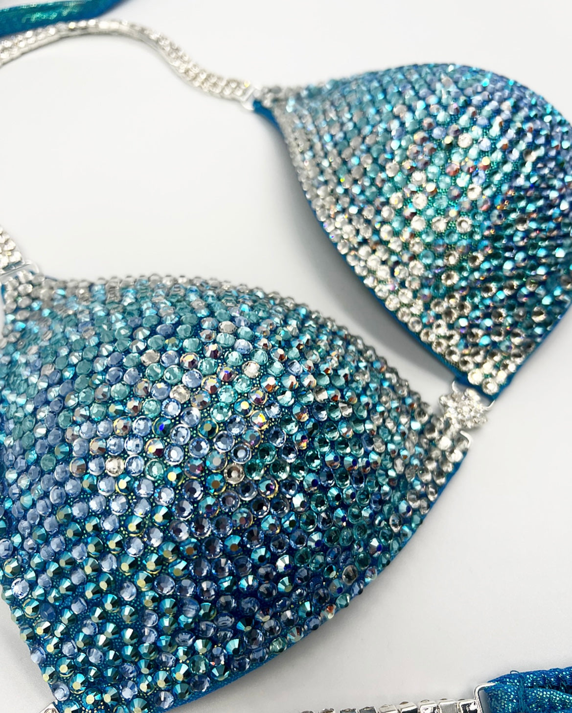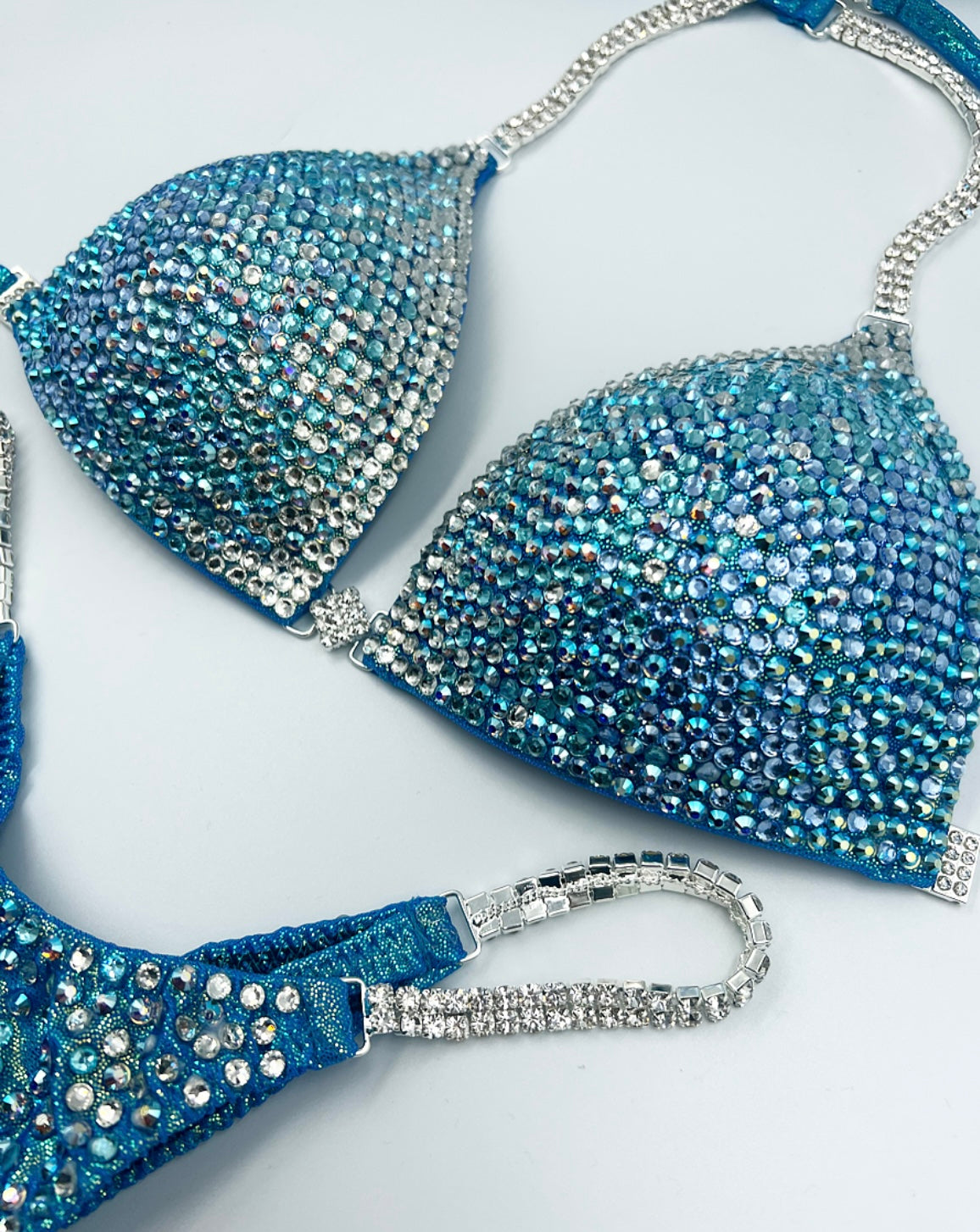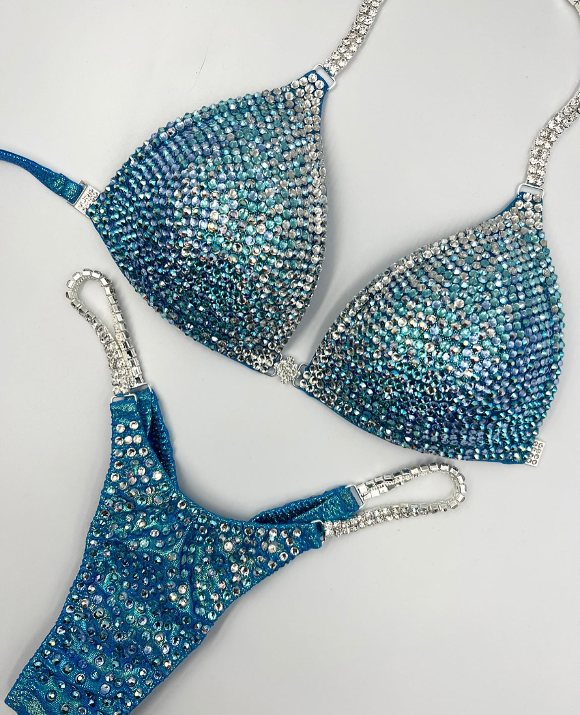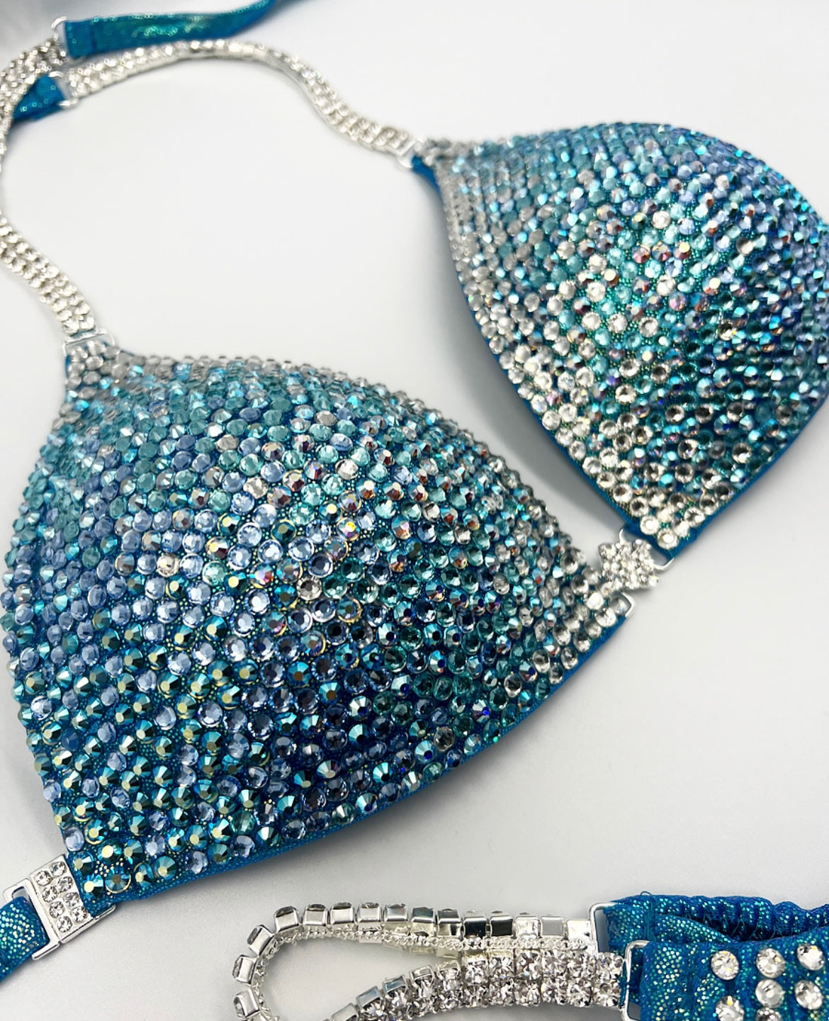 Gorgeous subtle ombré turquoise suit to really sparkle on stage! Two tone turquoise shine fabric base with a mix of czech glass & Preciosa crystals in clear, light sapphire AB, aquamarine, light sapphire & indicolite AB. With our 2 row strap connectors and a 3 row centre connector this look is sure to turn heads!