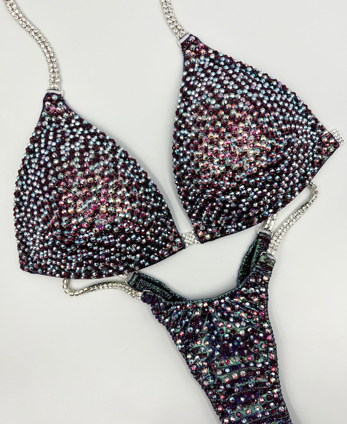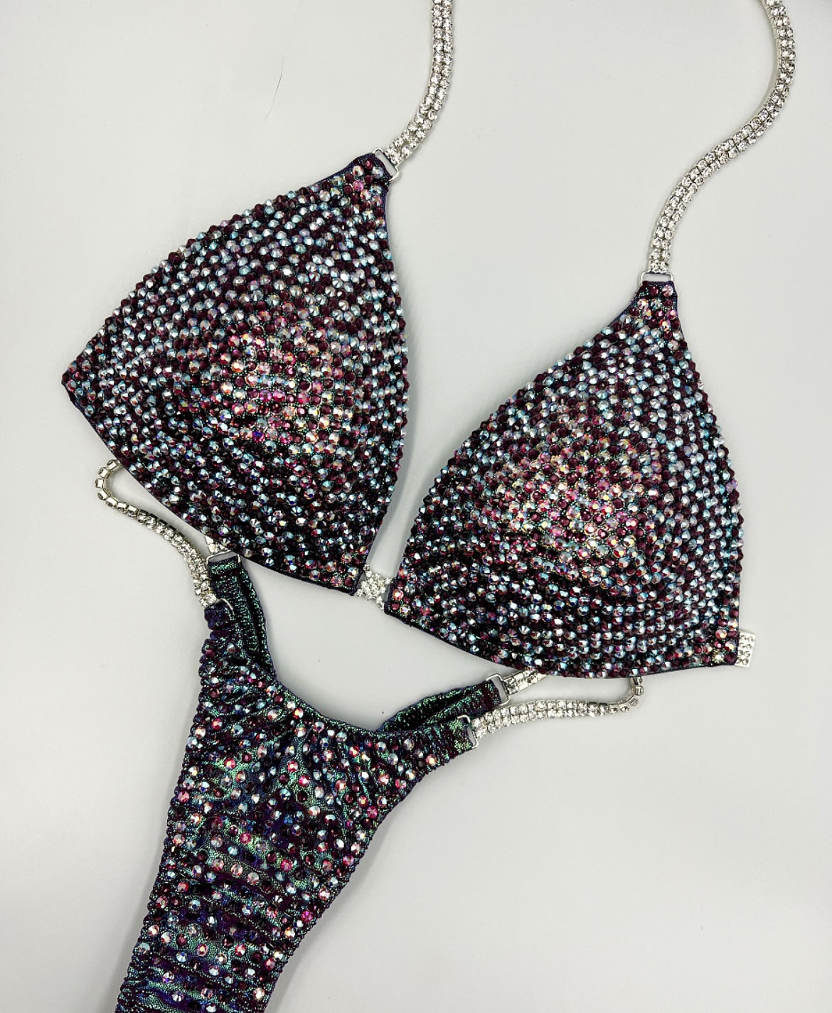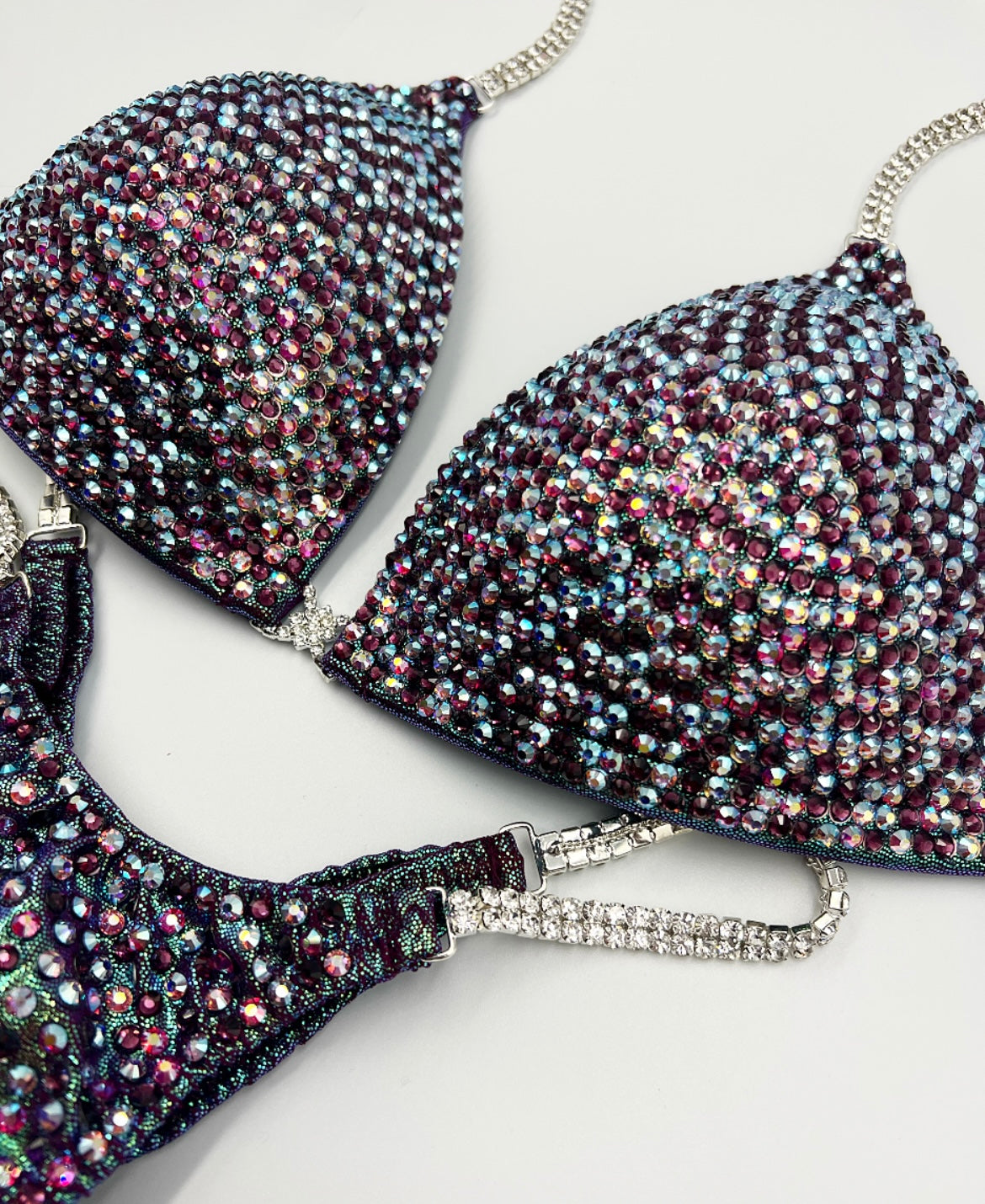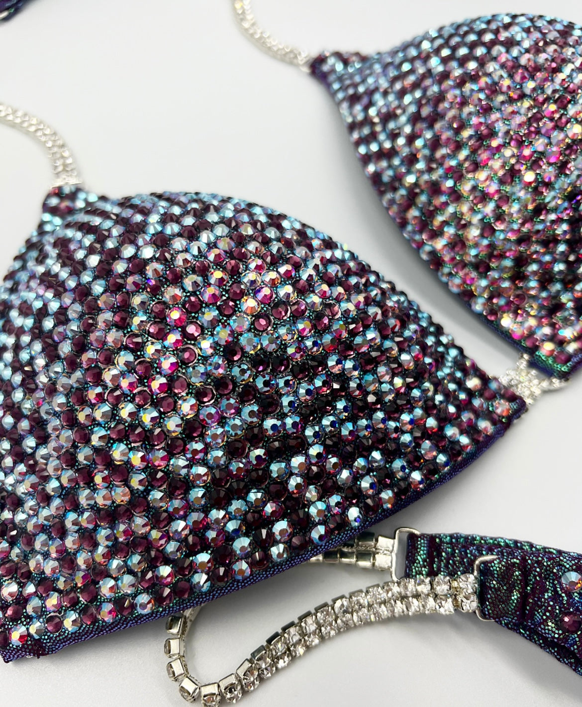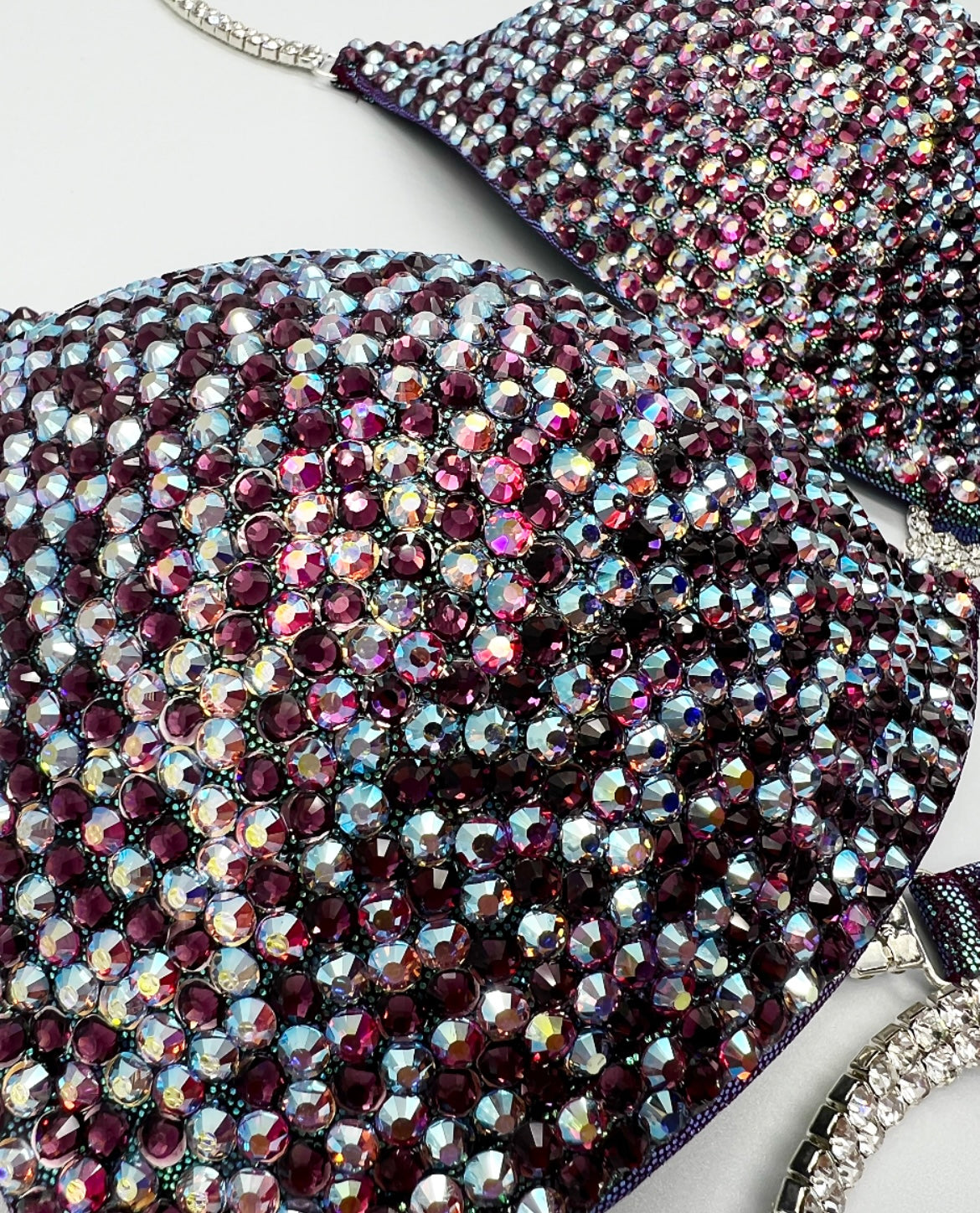 This one is so unique in colour and we are just obsessing over it! A gorgeous wine two tone lycra base with all Preciosa crystals for that extra sparkle in amethyst, fuchsia ab, light sapphire ab and violet ab.