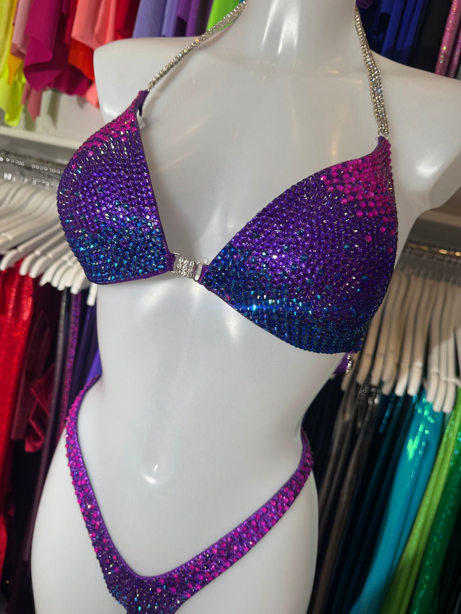 A gorgeous ex rental figure suit now reduced for resale. An ombre of neon purple, Cadbury purple and sapphire ab is a stand out on stage!