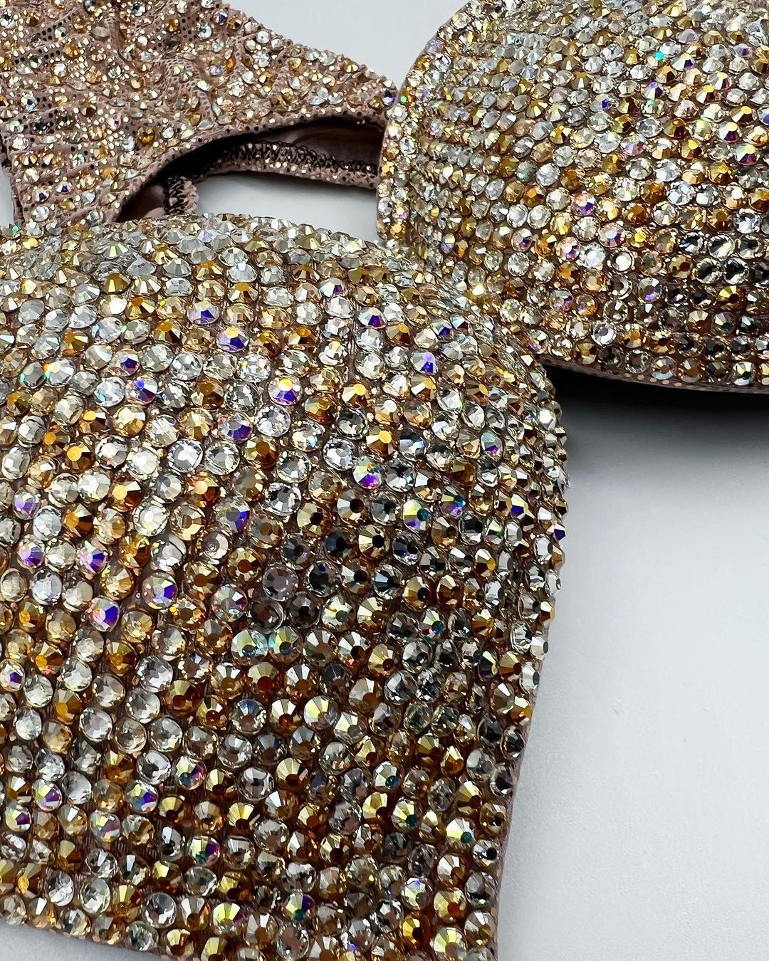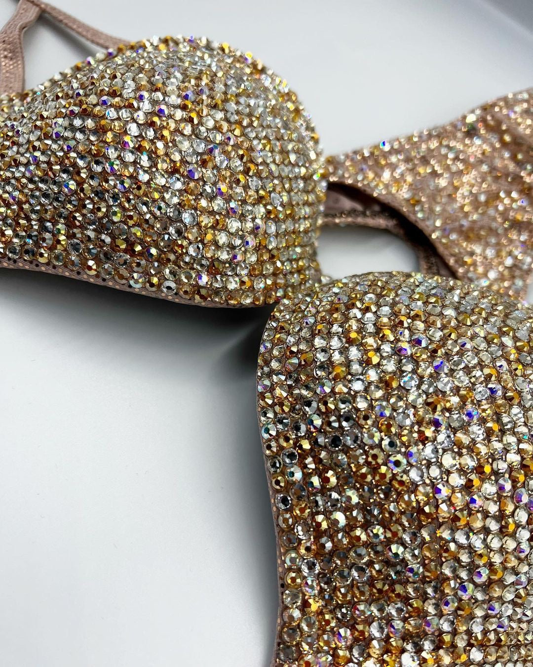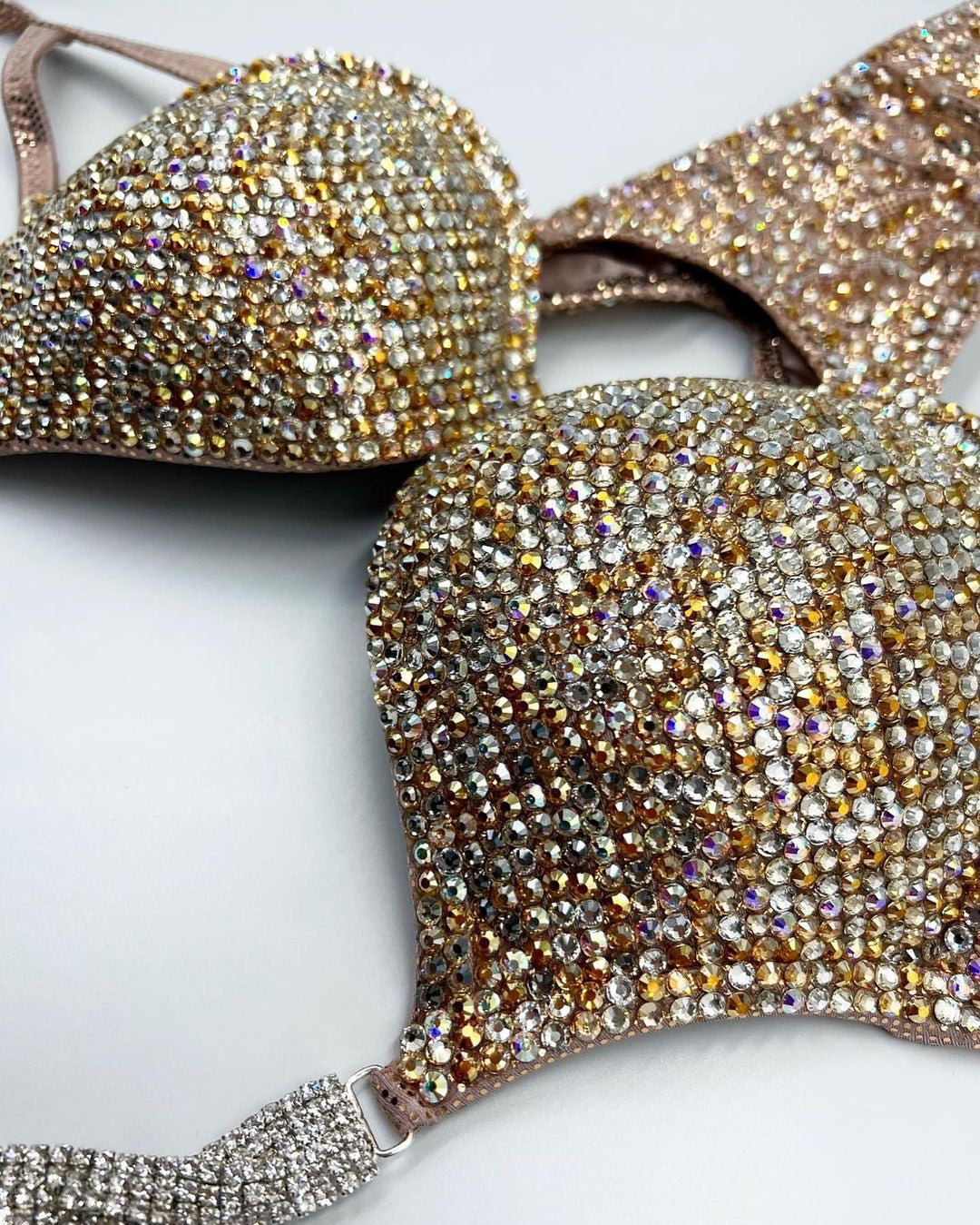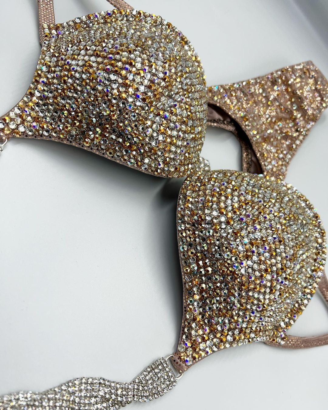 A beautifully golden bikini covered in a combination of 7 different colours; clear, clear AB, crystal sunrise, crystal honey, crystal velvet, golden honey & blond flare all on a beautiful copper zitto fabric base.