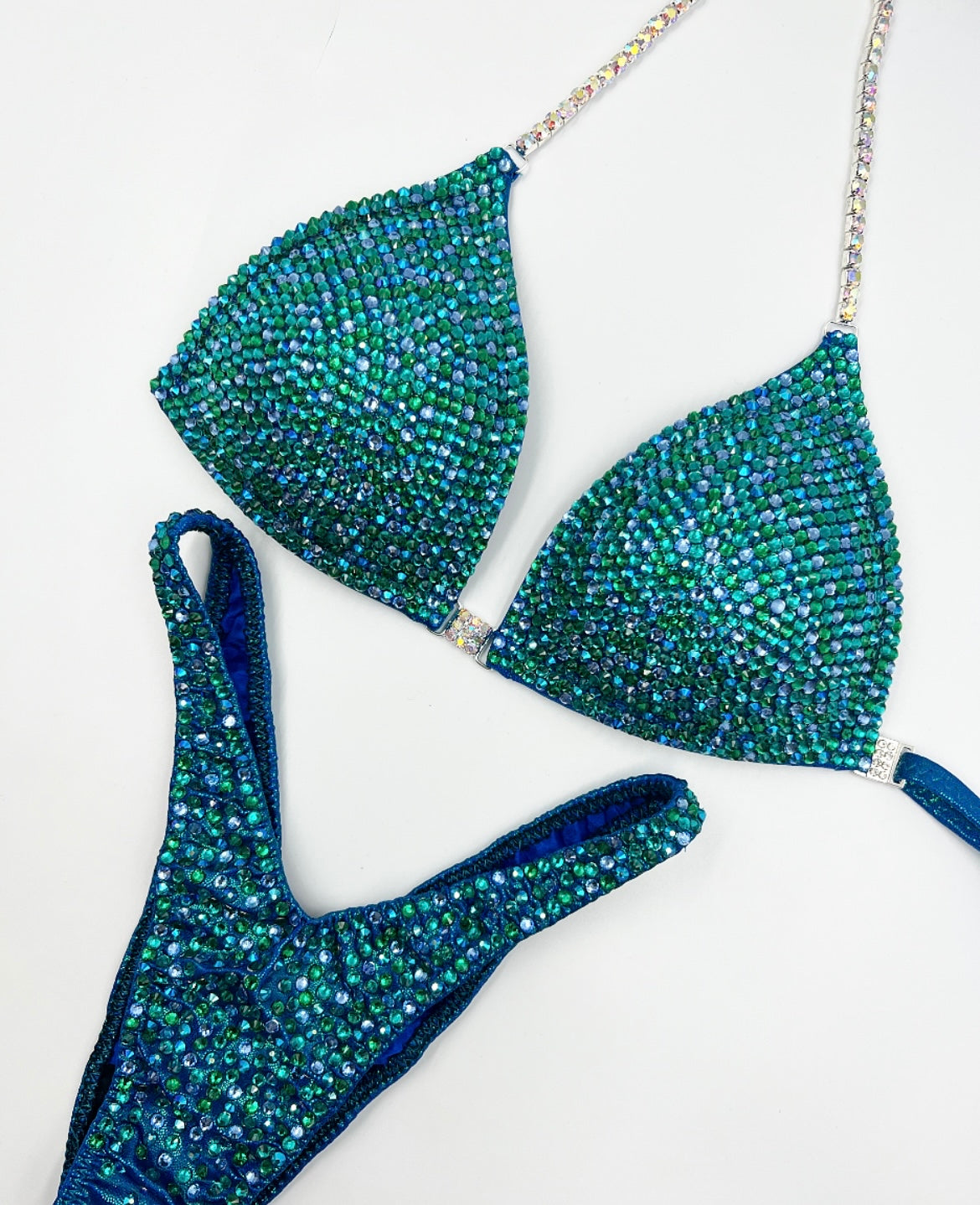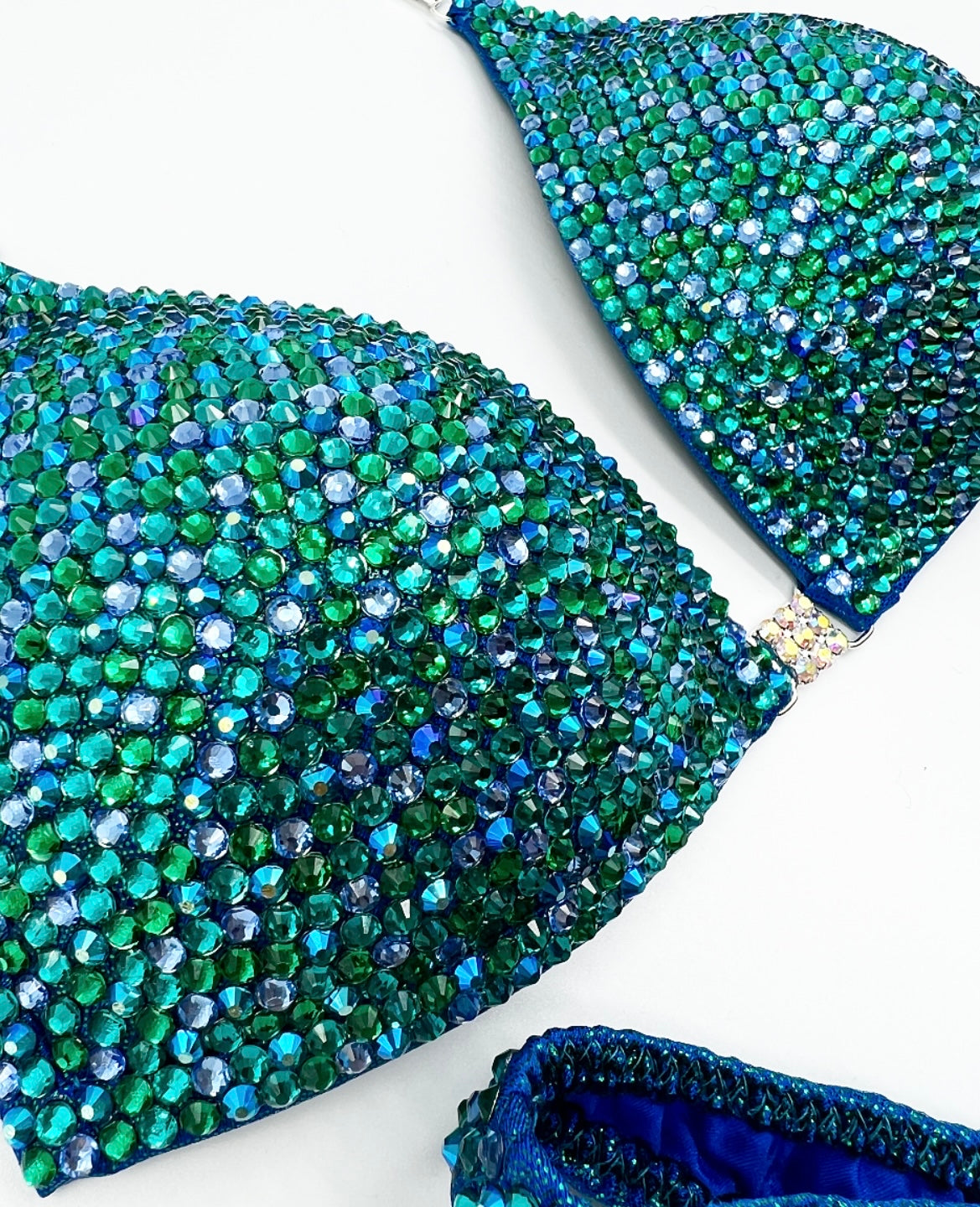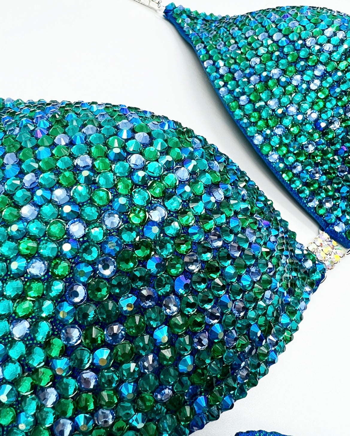 Mermaid vibes with this look! Green on blue shine lycra base with AB single row and 3 row connectors. With a mix of blues and greens on top!