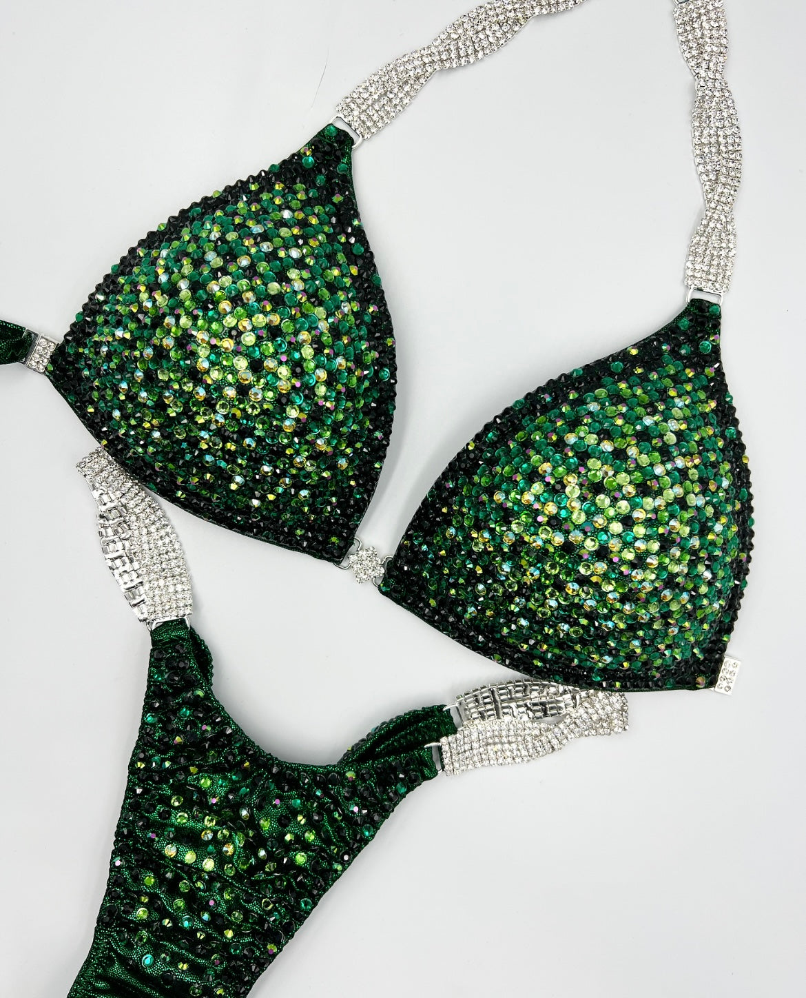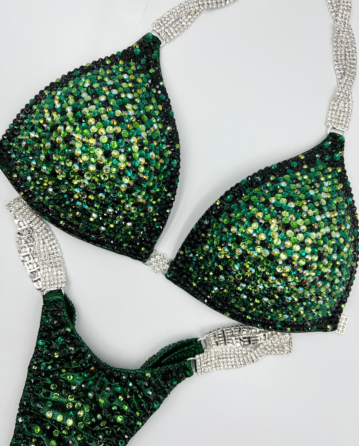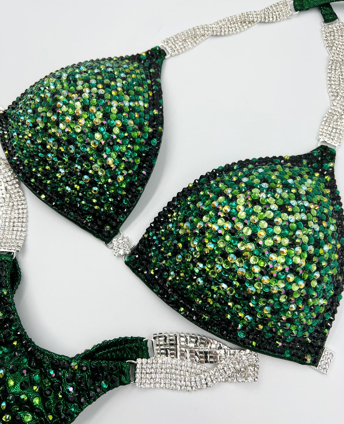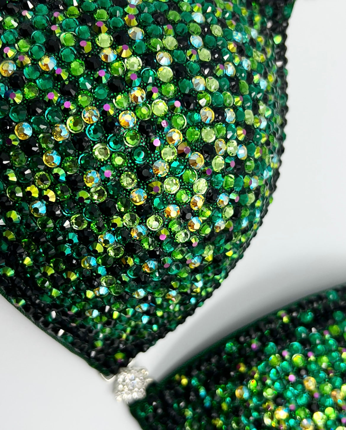 Gorgeous green and black mix suit to really stand out on stage! Emerite shine fabric base with preciosa glass crystals in jet, emerald, shamrock, peridot, peridot AB and peacock green. With our twist strap connectors and a diamond centre connector this look is sure to turn heads!