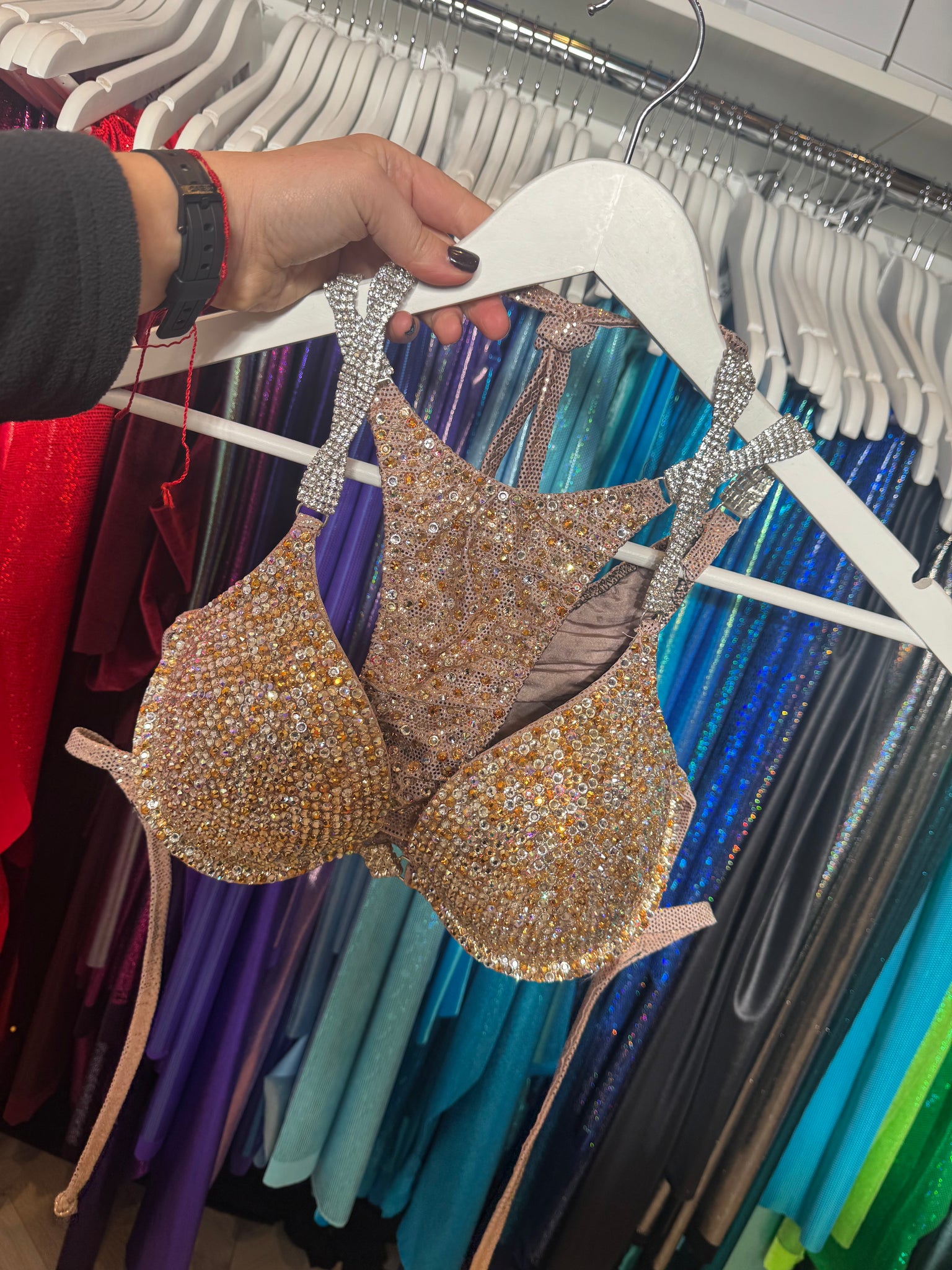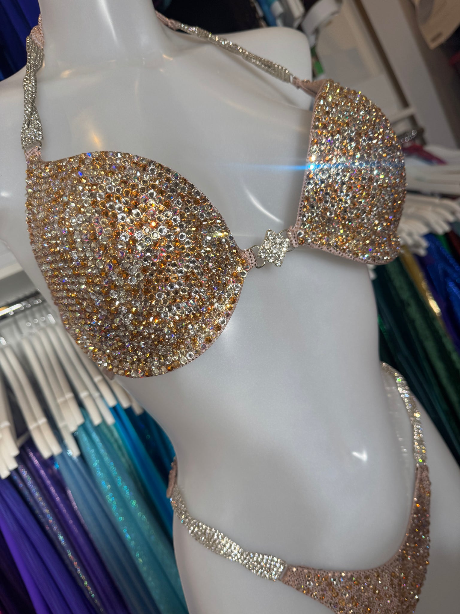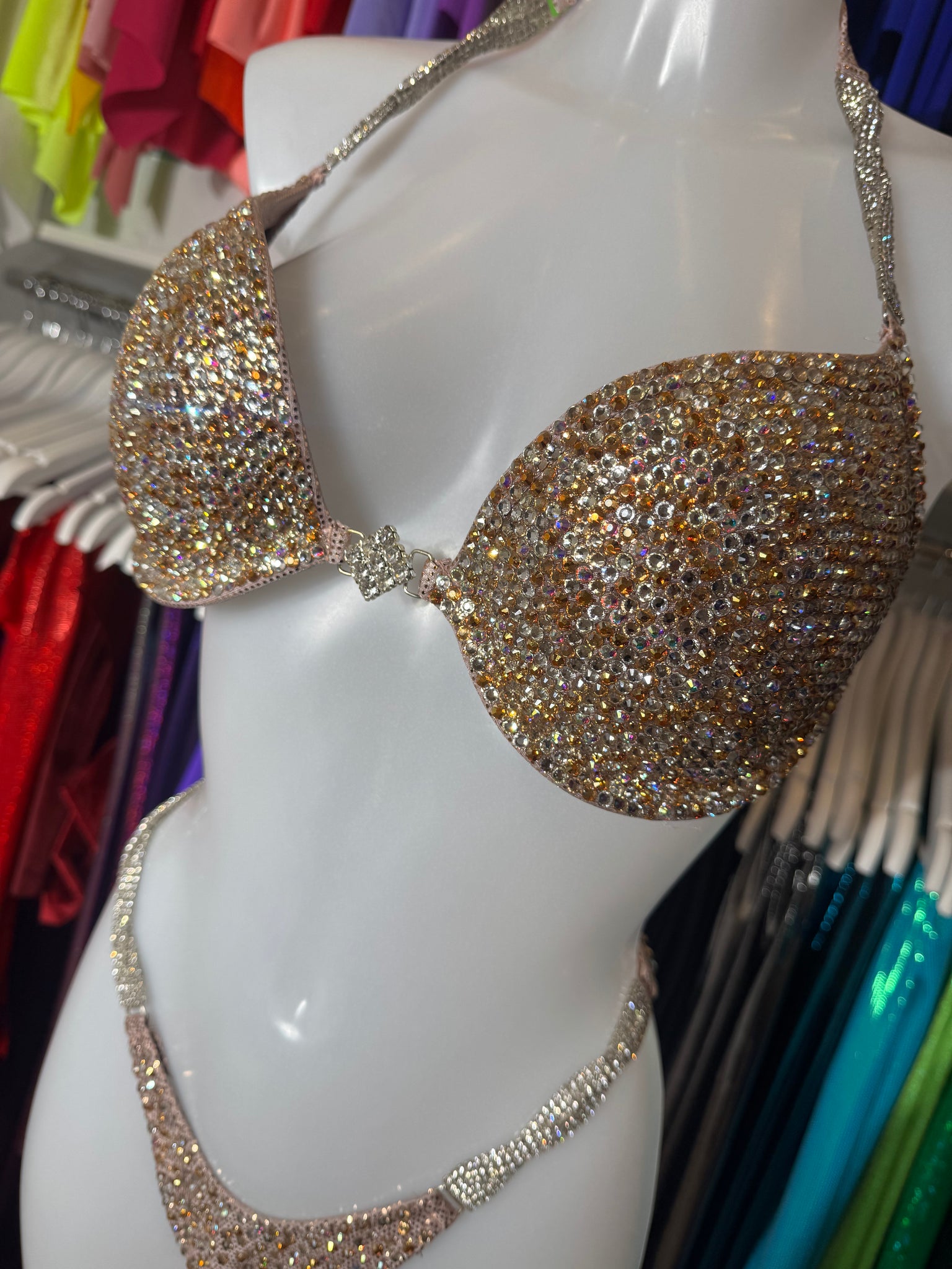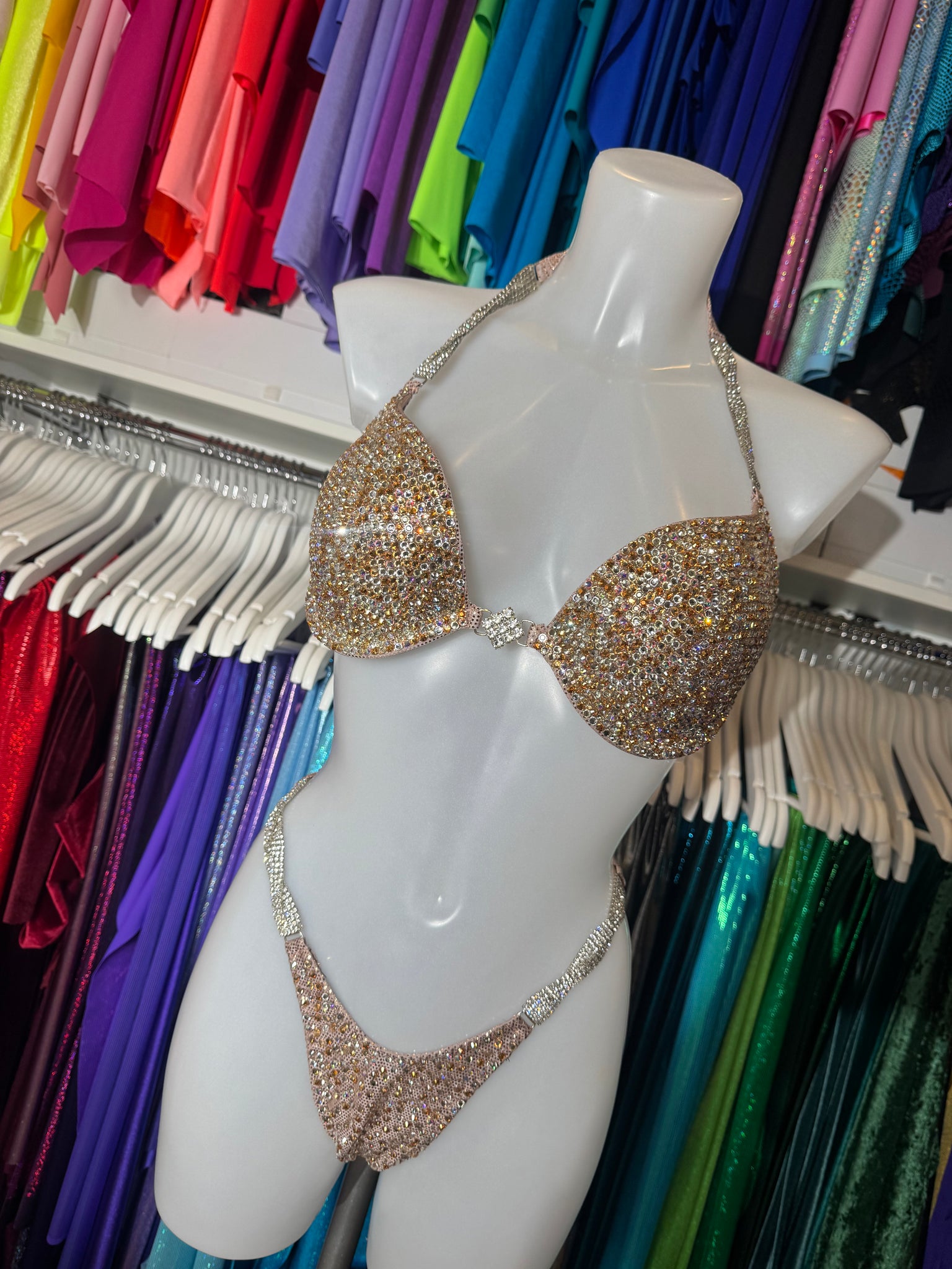 This stunning Gold stage suit has never been worn now up for resale after being a display bikini. This is our premium crystal using all Preciosa Crystal so has that extra sparkle.